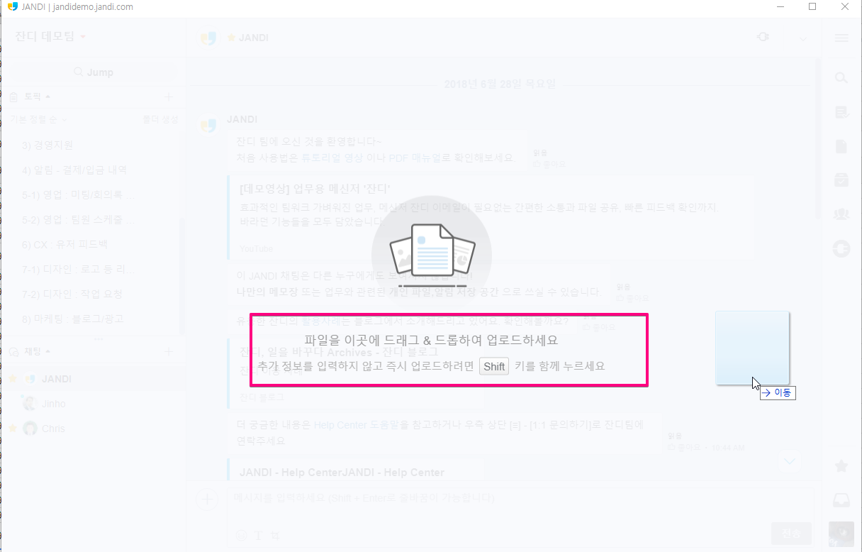 - Shift를 누른채 파일을 창에 끌어다 놓으면 별도의 댓글을 작성하지 않고 바로 업로드 됩니다.