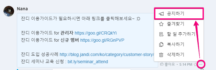 1. 공지사항으로 등록할 메세지에 마우스를 올려놓으면 우측에 생기는 (…) 더보기 – [공지하기]를 클릭해 주세요.