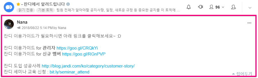 잔디의 경영지원팀은 신규 입사자들에게 제출 서류 및 기자재 세팅 방법을 안내할 때 공지사항 기능을 사용하고 있답니다. 아래 ‘잔디가 잔디 쓰는 법’ 영상에서 확인해보세요~