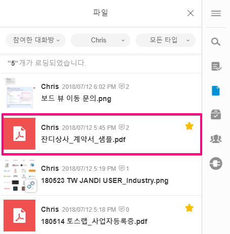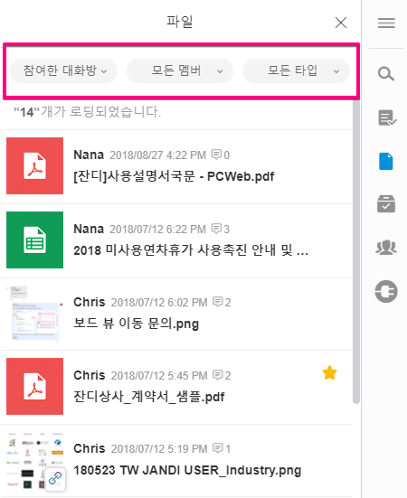 2. 검색 패널에서 찾고 싶은 파일을 처음 공유한 대화방/업로드한 멤버/파일 타입 중 생각나는대로 조건을 설정해주세요.
