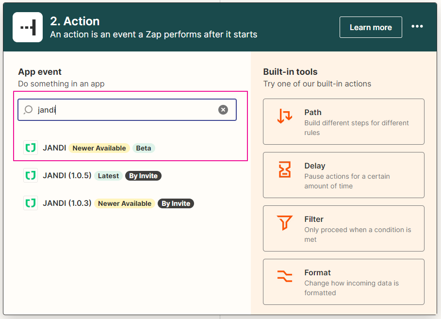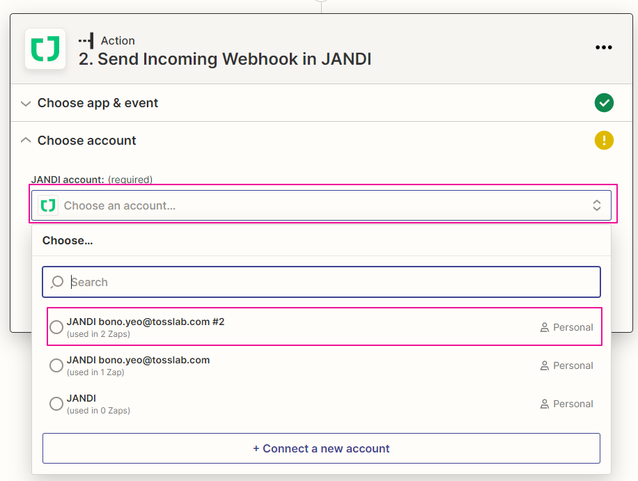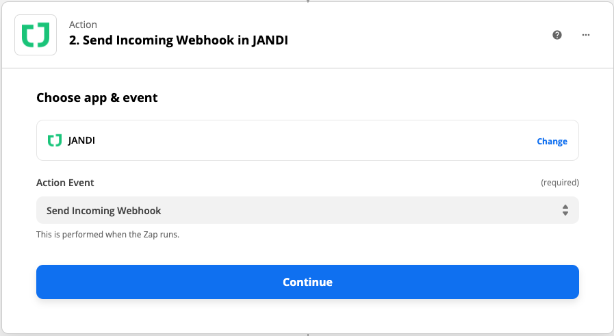 7. 위에서 받아온 구글 시트의 데이터를 이제 잔디 메시지로 변환할게요. Action – 2. Send Incoming Webhook in JANDI – Choose app & event 부분에서 ‘JANDI’를 검색해서 ‘JANDI’ 어플을 선택합니다.