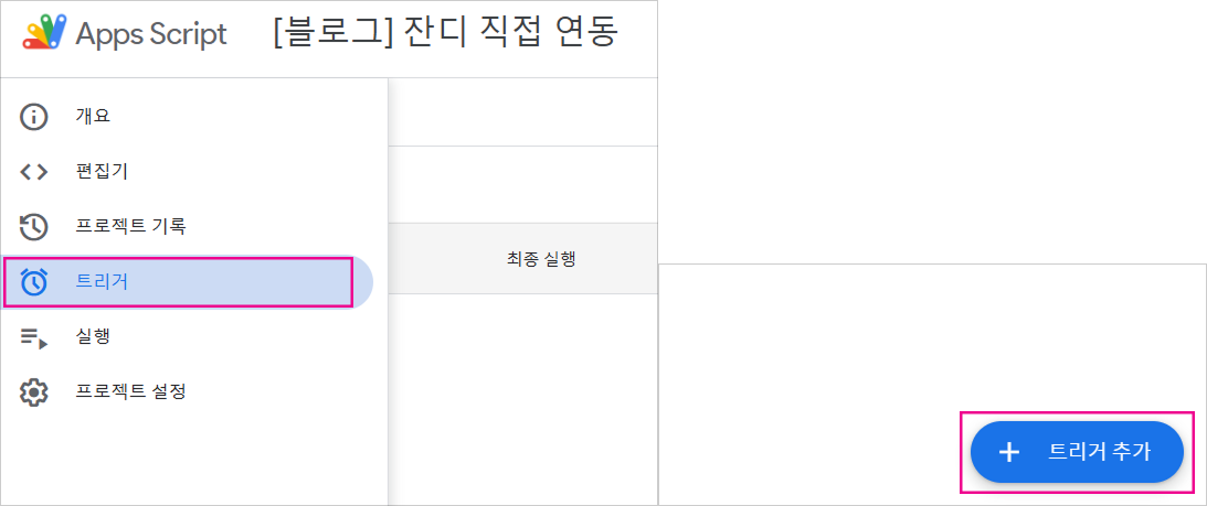 5. Apps Script 좌측의 [트리거]를 누르신 뒤, 우측 하단의 [+트리거 추가]를 눌러주세요.