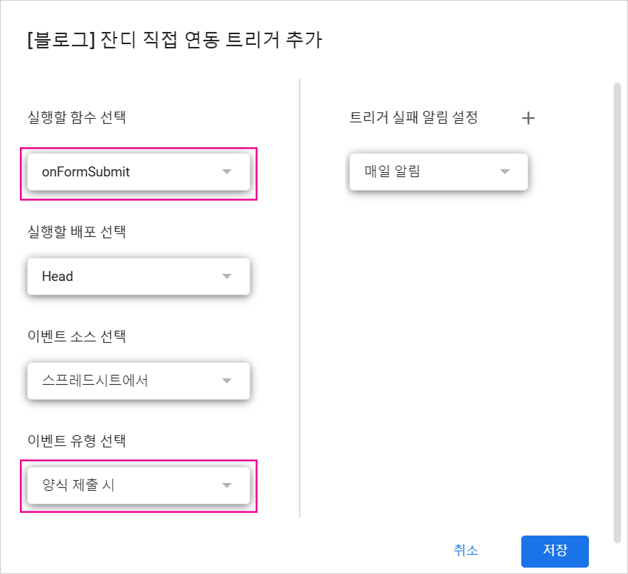 6. 마지막으로 실행할 함수 선택을 [onFormSubmit]으로 변경하고, 이벤트 유형 선택을 [양식 제출 시]로 변경 후 저장해주세요.