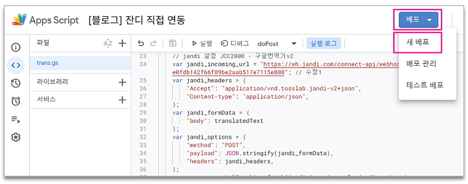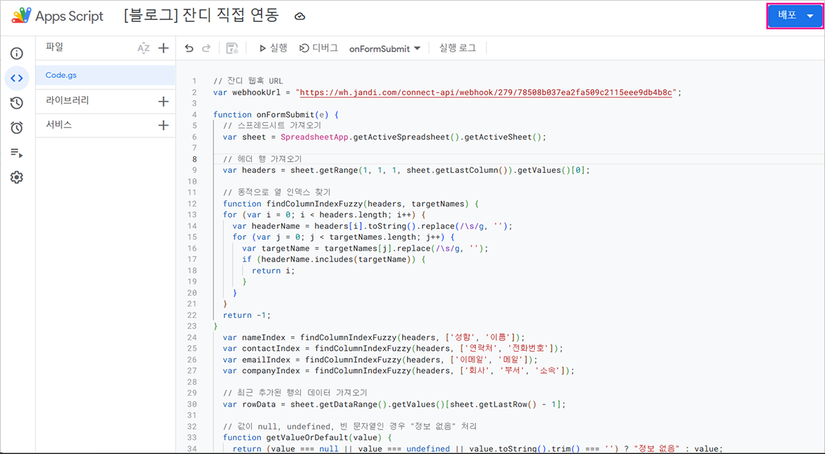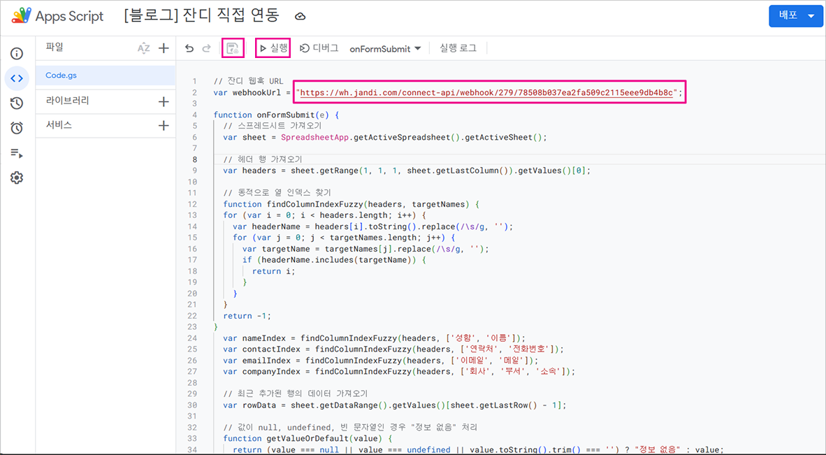 3. 코드 가장 위쪽의 잔디 웹훅 URL 란을 실제 웹훅 URL로 교체한 후, [저장] 및 [실행]해주세요.