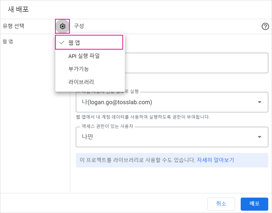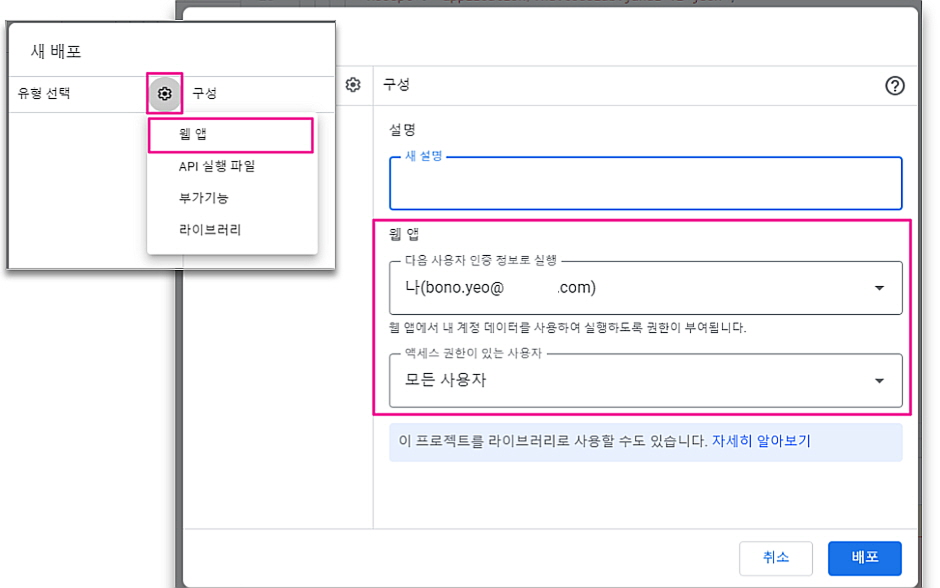 4. 우측 상단의 [배포]를 클릭, [새 배포] 클릭, [웹 앱]으로 배포해주세요.