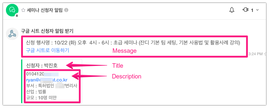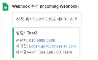모두 설정을 완료했다면, 구글폼으로 새로운 응답을 수신했을 때 아래와 같이 연동된 메시지가 들어오는 걸 확인할 수 있습니다.