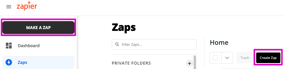 1. 구글 스프레드 시트와 잔디 커넥트 웹훅을 연결하기 위해 재피어(Zapier)에 들어갑니다. 로그인 후, 메인 화면 좌측 상단의 + 클릭 후 [Make A Zap!] 버튼을 클릭합니다.