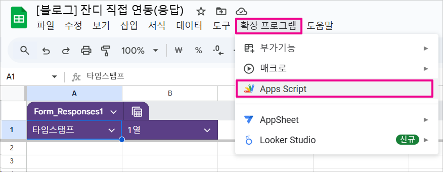 1. 연동할 구글폼 응답 시트(스프레드시트)에서 [확장 프로그램]을 누른 후 [Apps Script]를 클릭해주세요.