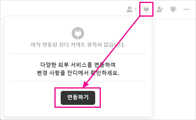 1. (구글 스프레드 시트 정보를 연동할) 토픽 우측 상단에 플러그 모양의 [잔디 커넥트] 플러그 아이콘 버튼을 누른 후에 [연동하기]를 클릭해주세요.
