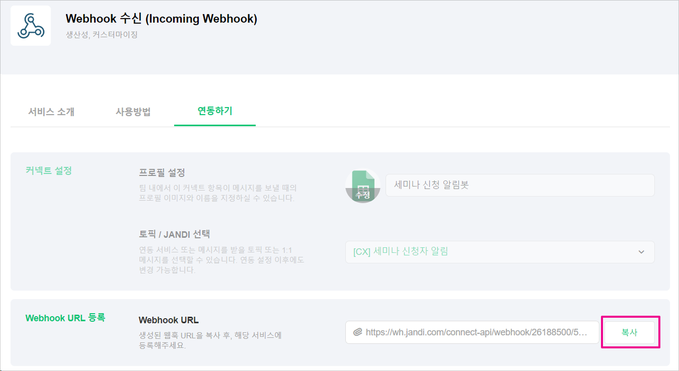 - Webhook URL은 [복사하기] 버튼을 클릭해 클립보드에 저장합니다.
