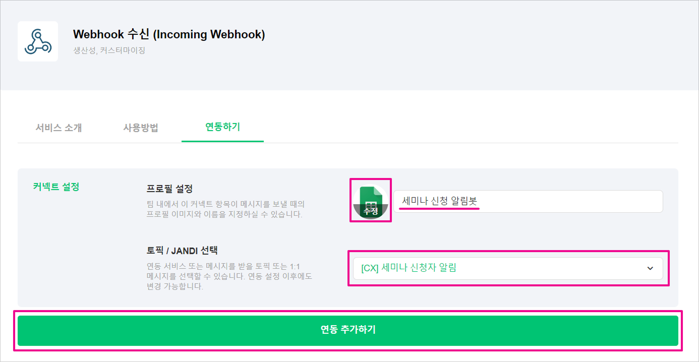- 설정 및 확인을 완료했다면 [연동 추가하기] 버튼을 눌러주세요.