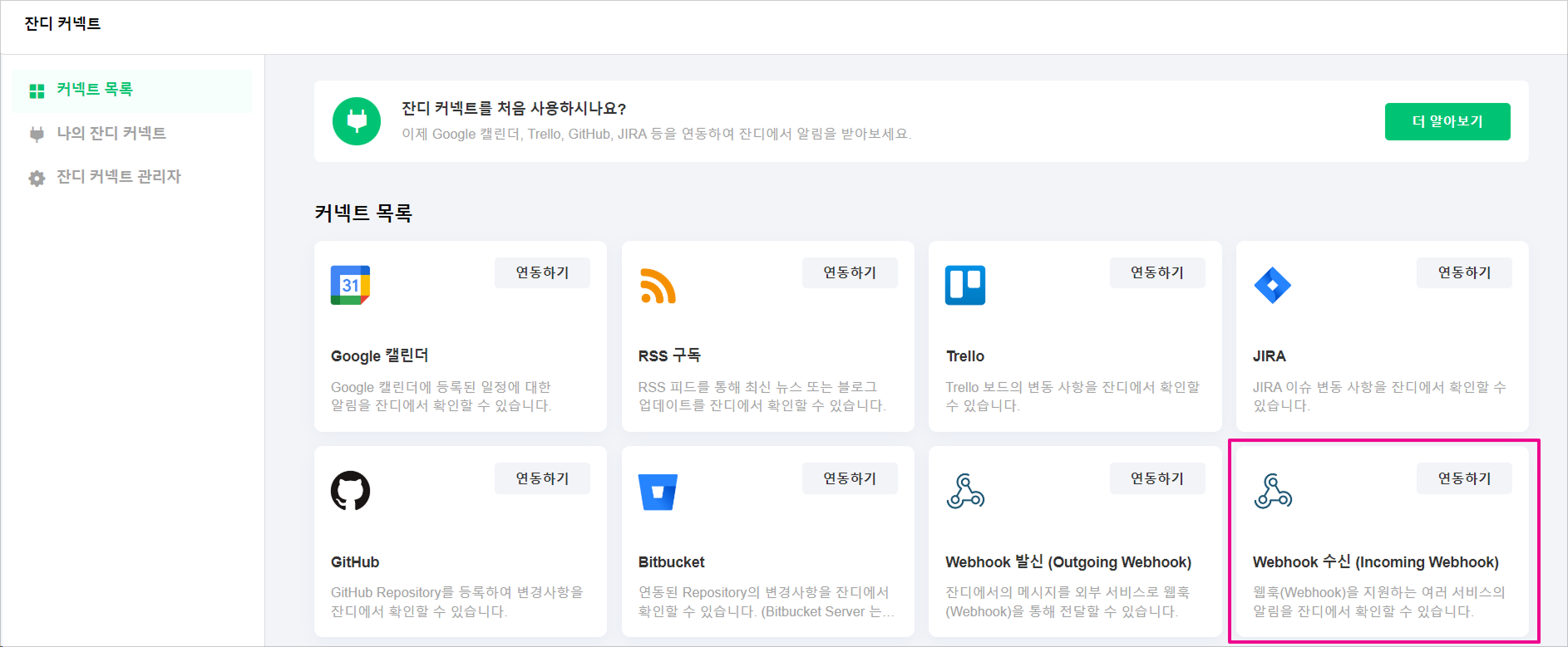2. 잔디 커넥트 항목 중 제일 우측 하단에 있는 [Webhook 수신 (Incoming Webhook)] 의 [연동하기] 버튼을 클릭합니다.