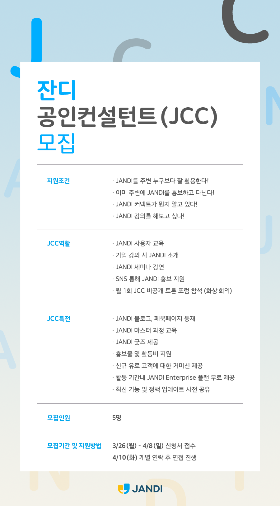 잔디 공인 컨설턴트(JCC)를 모집합니다. 게시일: 2018. 03. 26 Share 🕑 리딩타임: < 1 분잔디 공인 컨설턴트 (JANDI Certified Consultant)를 모집합니다. 잔디를 직접 널리 알리고 싶으신 분을 찾고 있습니다. 누구보다 업무용 메신저 잔디를 잘 활용하고 다른 분들에게도 자신의 활용사례를 공유하고 싶으신 분이 있다면 아래 내용을 확인한 후 많은 지원 부탁드립니다. [JCC 지원하기 링크] [JCC 지원하기 링크] 포스트 뷰: 2,872 JANDIJCC강사생산성 강의업무용 메신저 Share