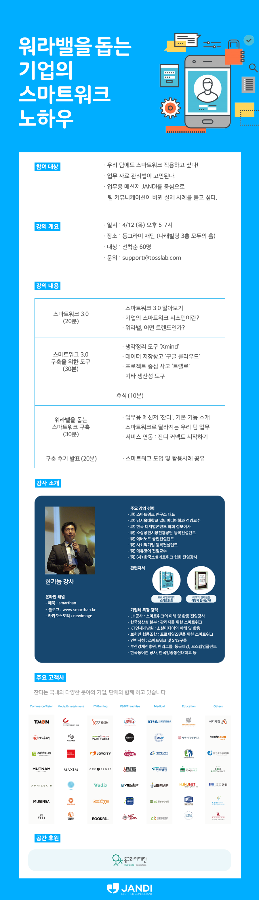 잔디를 중심으로한 스마트워크 도입 방법과 생산성 툴 노하우를 알려드립니다.