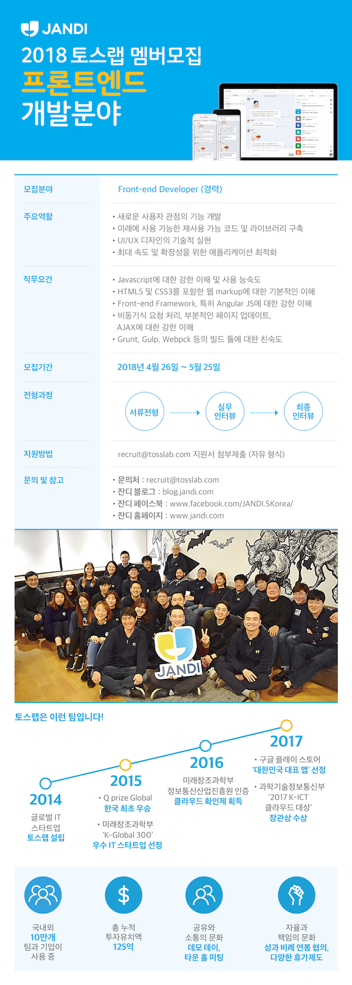 [모집공고] 프론트엔드 개발자 게시일: 2018. 04. 26 Share 🕑 리딩타임: < 1 분<잔디, 함께 가꾸실래요?!> 잔디를 함께 만들고 키워나갈 개발팀 멤버를 찾습니다! 모집분야 : 프론트엔드 모집기간 : 2018. 04.26 ~ 05.25 recruit@tosslab.com 지원서 제출 (자유형식) 포스트 뷰: 3,035 developdevelop toolDeveloperfront-endfront-end 개발 Share