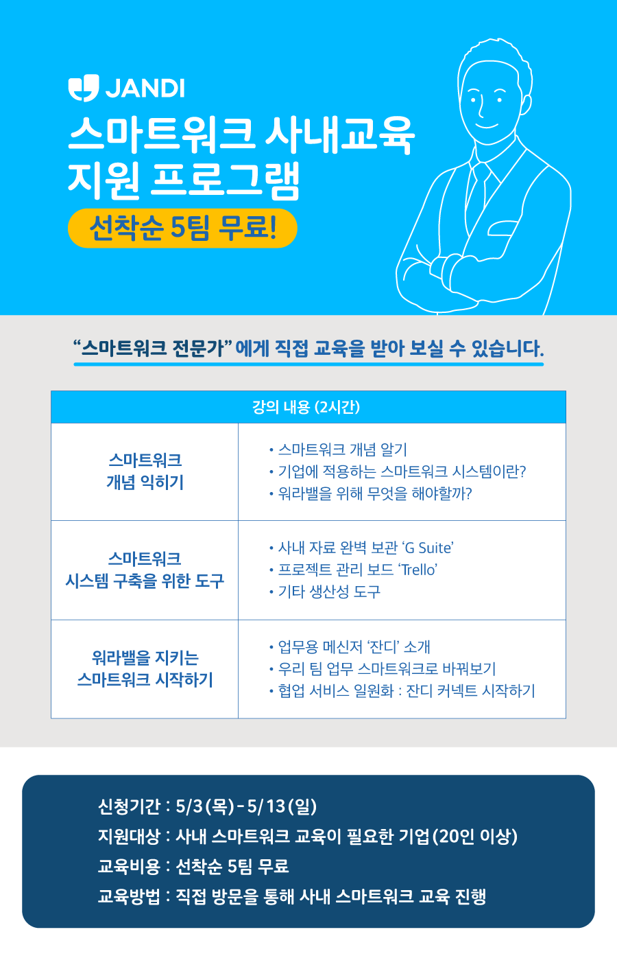 [이벤트] 스마트워크 사내교육 지원 프로그램 게시일: 2018. 05. 03 Share 🕑 리딩타임: < 1 분 포스트 뷰: 2,898 companycompany educationeducationeventJANDI Share