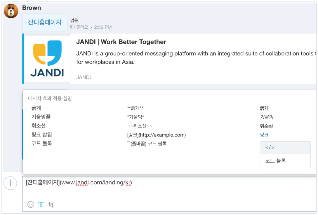 다양한 형식으로 (굵게, 기울임, 취소선, 링크 삽입, 코드 블록) 메시지를 입력할 수 있습니다.