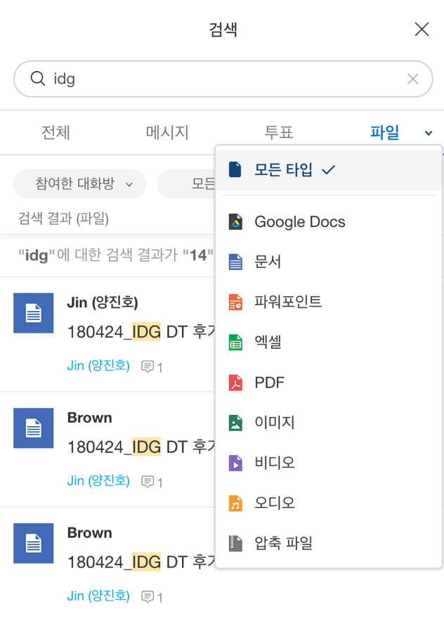 잔디에서는 통합검색이 가능합니다. 파일명, 파일형식, 기간, 멤버, 대화방(토픽)에 따른 검색 설정이 가능합니다.