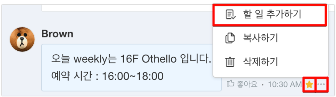 받은 메시지 중 중요 메시지를 ‘즐겨찾기’ 또는 ‘할 일로 추가’하면 별도의 메모가 필요 없습니다.