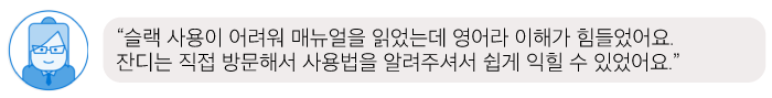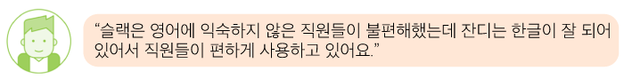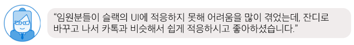 앞서 살펴본 바와 같이 슬랙은 언어나 사용성 측면에서 낯설고 생소한 부분이 많습니다. 특히나 부장님이나 상무님, 전무님, 사장님과 같은 분들에게는 더욱 부담스럽고 어려운 존재일 수도 있습니다. 이렇게 팀 내 누군가가 협업툴 사용에 어려움을 겪는다면 제대로 된 협업이 이루어지기 어렵겠죠?