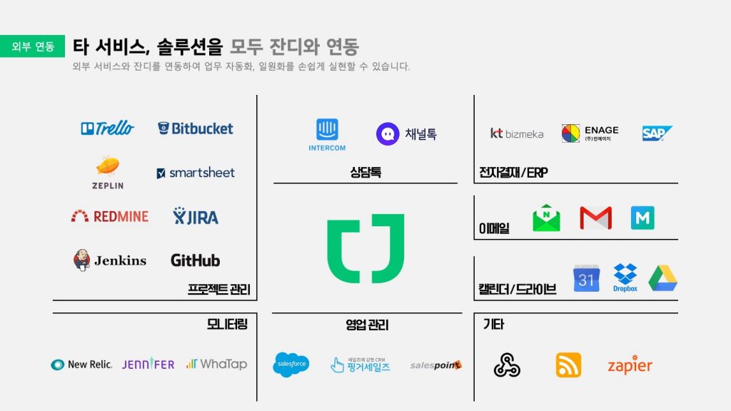 슬랙은 다수의 연동 서비스를 제공하고 있지만 개발 직군에 특화되어 있거나 아시아권에서는 생소한 글로벌 서비스가 대부분입니다. 잔디는 구글 캘린더(Google Calendar), 트렐로(Trello), 지라(JIRA), 깃허브(GitHub), 비트버킷(Bitbucket) 등 아시아권에서도 활발하게 사용되는 서비스를 중심으로 연동을 제공하고 있으며 웹훅(Webhook)을 이용해 그룹웨어와 같은 기존의 사내 시스템과도 연동이 가능합니다.