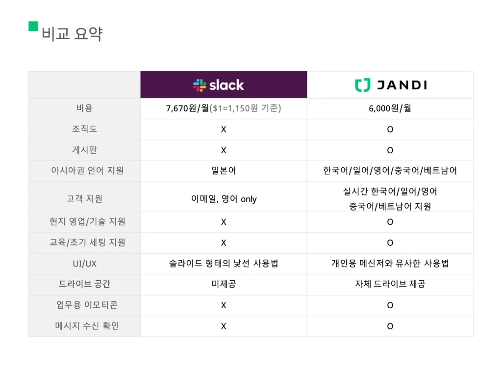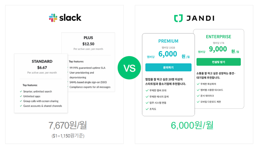 인당 금액을 지불하는 서비스형 소프트웨어(SaaS)를 사용할 때에는 비용도 큰 고민입니다. 잔디는 슬랙보다 저렴하게 사용할 수 있기 때문에 비용 부담을 덜 수 있고 한화(KRW)로 지불하기 때문에 항상 비용이 일정합니다. 슬랙의 경우 현지 통화(USD)로 지불해 환율에 따라 비용이 고정적이지 않고, 환율이 상승하면 금액을 추가로 부담해야 합니다. (한 고객사의 경우 200명 기준으로 단체 할인을 적용받고 최근 환율 상승으로 인해 Enterprise Plan 기준 2.4배 견적 차이를 보임)