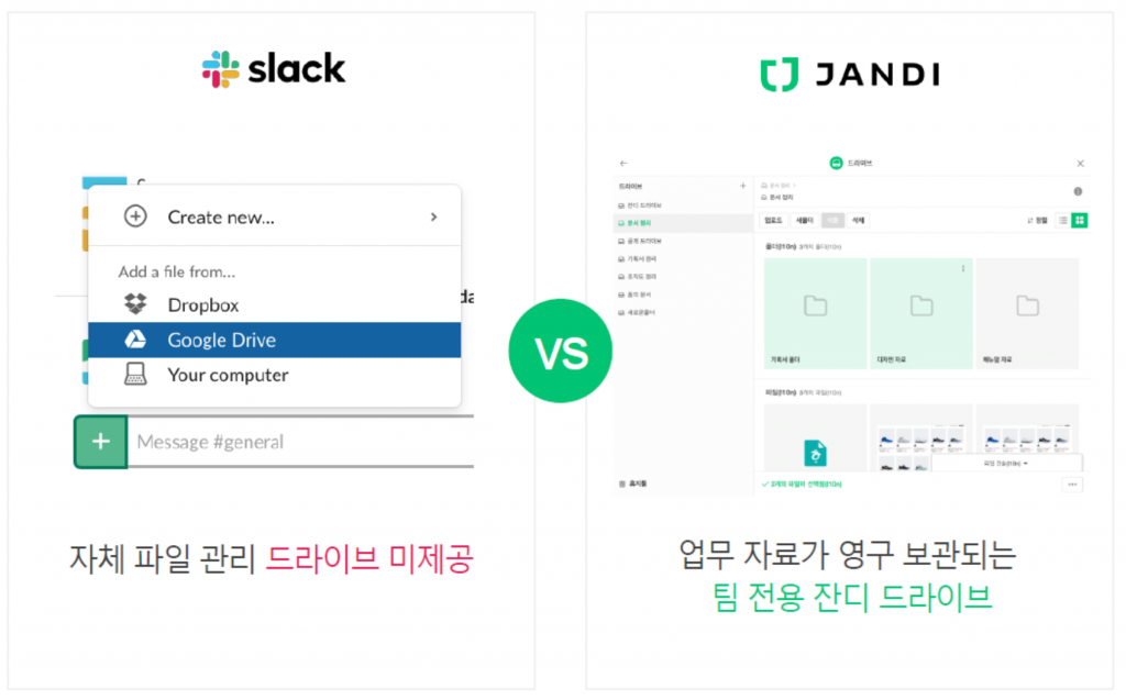 잔디에서는 자체적으로 파일을 관리하고 공유할 수 있는 잔디 드라이브를 제공하고 있습니다. 외부 드라이브를 사용하지 않아도 자료 아카이빙이 가능합니다. 슬랙은 자체 드라이브가 없어 외부 드라이브를 함께 사용해야만 합니다.