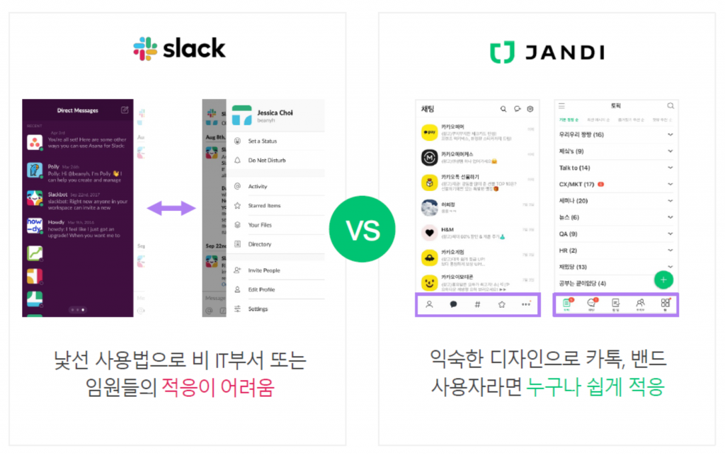 반면 슬랙을 처음 사용한다면 조금 낯설고 익혀야 할 것이 많습니다. 그래서 슬랙이 결국 메신저 용도로만 사용되는 경우도 있다고 하는데요. 누구나 쉽게 사용할 수 있는 것이 협업툴로서 더욱 효과적이겠죠?