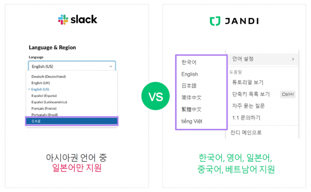 한국어를 지원하지 않는 슬랙과는 달리 잔디는 한국어를 비롯해 영어, 중국어(간체/번체), 일본어, 베트남어를 모두 지원하고 있어 팀 내 사용은 물론 해외 지사와의 협업 시에도 속도나 언어 장벽의 문제없이 사용할 수 있습니다.