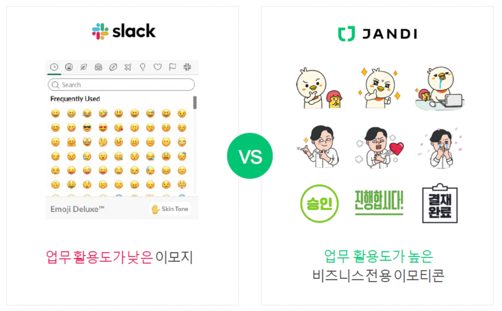 잔디에는 카카오톡이나 라인에서 자주 사용하는 이모티콘처럼 업무 환경에서 사용할 수 있는 비즈니스 전용 이모티콘이 들어있습니다. 슬랙의 텍스트 크기의 이모지(Emoji)보다 활용도가 더 높고 재미있으며 한결 부드럽게 소통할 수 있습니다.