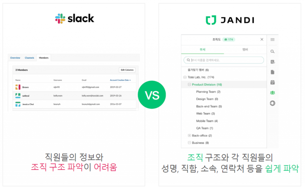 직급과 체계가 중요시되는 아시아권에서 협업을 잘 하기 위해서는 팀원들의 직함, 소속, 연락처를 쉽게 파악할 수 있는 조직도가 매우 유용합니다. 잔디는 조직도를 제공해 부서별 팀원의 정보를 바로 알 수 있지만 슬랙은 이를 제공하지 않아 정보를 알기 어렵습니다.