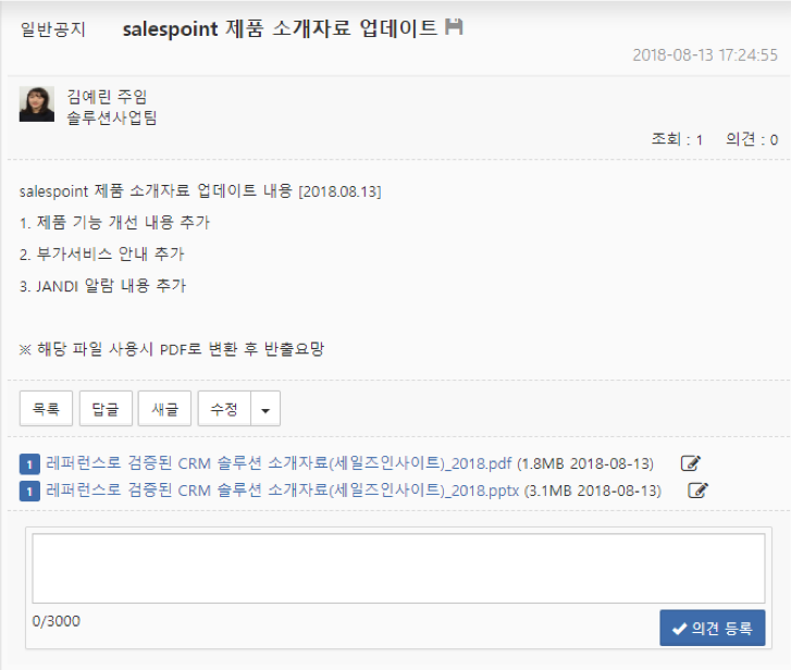 Salespoint 내에는 각 데이터에 본인의 의견 또는 댓글을 달 수 있는 기능이 곳곳에 마련되어 있습니다. 고객사나 고객, 영업기회와 계약 건들 이외에도 활동현황, 업무일지, 게시판 등 다양한 곳에 새로운 내용이 추가되었을때 상세한 알람을 설정할 수 있어서 누군가가 의견을 등록하면 작성자에게 변경된 내용에 대한 알람이 울리기 때문에 유용합니다. 보통 업무 진행방향 논의나 업무지시 등 다양하게 의견을 활용하고 있습니다.