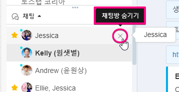 채팅방을 숨기는 방법은 다음과 같습니다. 채팅 목록에서 숨기고자 하는 팀 멤버 이름 위에 마우스를 올려놓으면 채팅방 숨기기 (X)를 클릭할 수 있습니다. 채팅방이 너무 많아 정리를 하고 싶을 때, 자주 대화하는 대화방만 남겨놓고 싶을 때에 채팅방 숨기기 기능으로 정리해 보세요!
