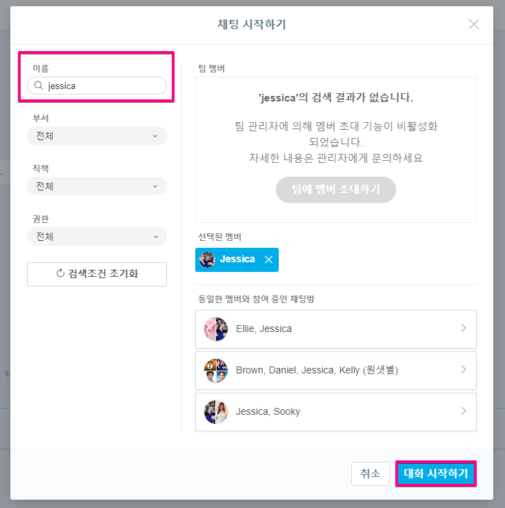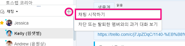 또한, 숨겨진 채팅방을 다시 확인해야 할 때에는 [+] 채팅 시작하기에서 찾고자 하는 팀 멤버의 이름을 검색해서 대화를 다시 시작하거나 이전 히스토리를 확인할 수 있습니다. 또한, 대화방 점프 기능을 통해서도 찾으실 수 있습니다.