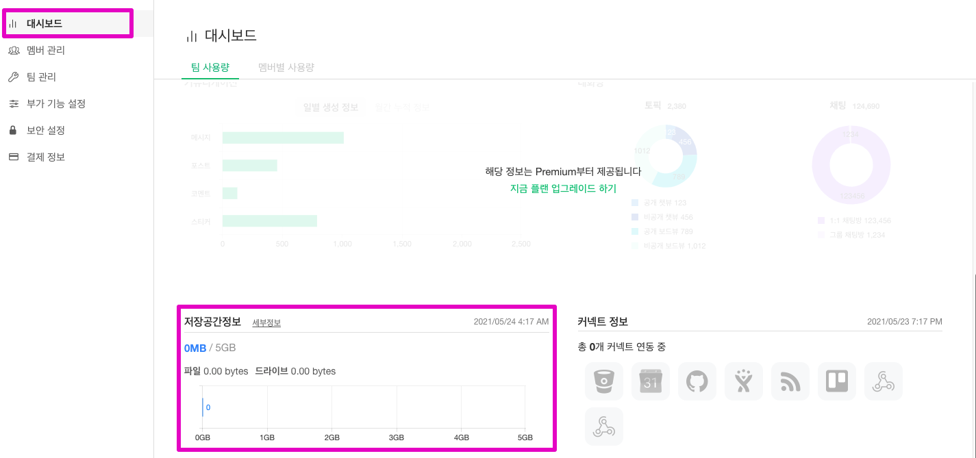 [≡] – [관리자 메뉴] – [팀 사용량]에서 전송한 메시지 개수와 사용 중인 파일 용량을 확인해보세요. 팀 사용량을 틈틈히 확인하시면 파일 저장 공간을 확보하실 수 있습니다.