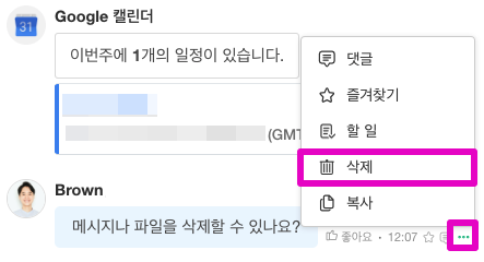 메시지에 마우스를 올렸을 때 나타나는 […] 더보기 버튼을 클릭해 [삭제]를 선택합니다.