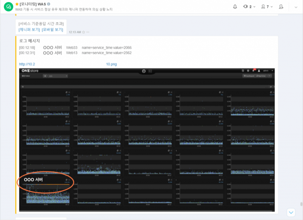 - 예) OOO 서버가 지연되는 문제가 발생해서 자동으로 잔디에 연동된 제니퍼 서비스 모니터링 알림 메시지가 도착했습니다. 아래 그림의 주황색 띠(=장애를 뜻함) 부분이 문제가 있네요!