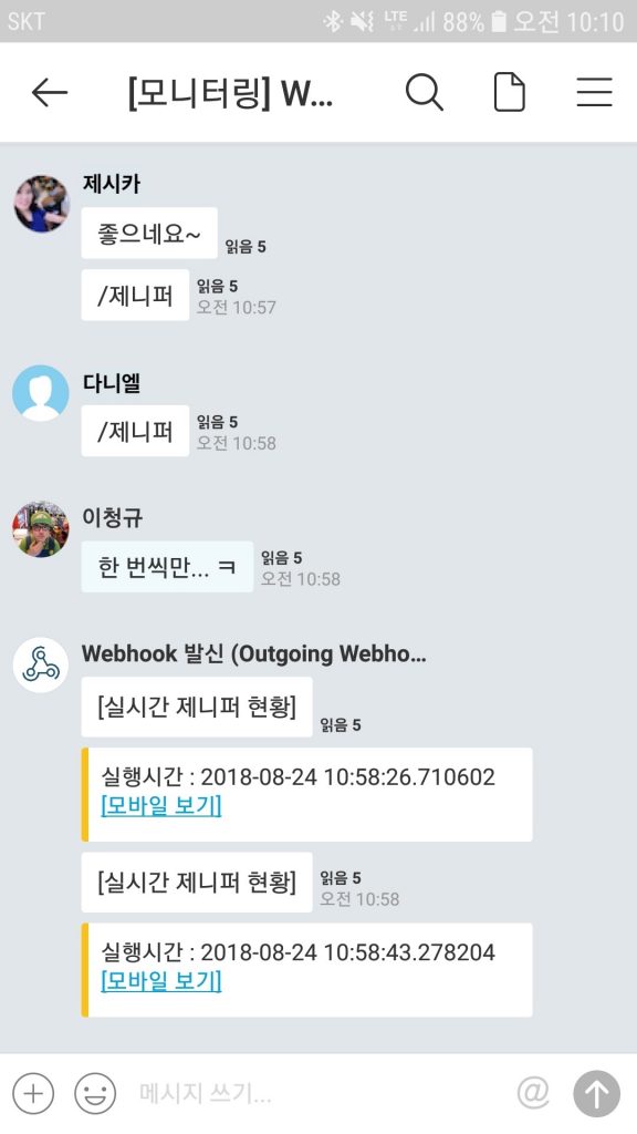 인커밍 웹훅과 아웃고잉 웹훅을 서비스 모니터링에 콜라보한 최초 사례가 아닐까 싶네요. 하핫 ^^