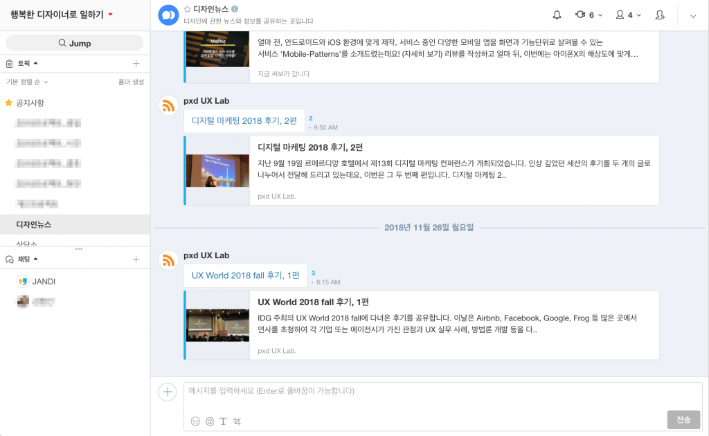 디자인 트렌드와 소식을 알려주는 RSS 기능입니다. 디자이너로서 트렌드와 레퍼런스를 항상 체크해야 하는데요. 저는 출근하면 레퍼런스 사이트들을 한 번씩 방문하는 습관이 있습니다. 물론 비는 시간에도 틈틈이 확인하고요. 수많은 사이트를 돌아다니며 레퍼런스들을 체크하니 오전 시간이 금방 지나가곤 했습니다. 그렇다고 트렌드에 뒤처질 수 없으니 그만둘 수도 없고요. 잔디커넥트를 통해 RSS를 받으니 일일이 사이트에 들어가지 않아도 매일 아침 레퍼런스 사이트들을 체크할 수 있습니다. 업무 중간에도 제목만 읽고 필요한 것들은 보관해둘 수 있어서 편리함의 최고봉인 것 같습니다.