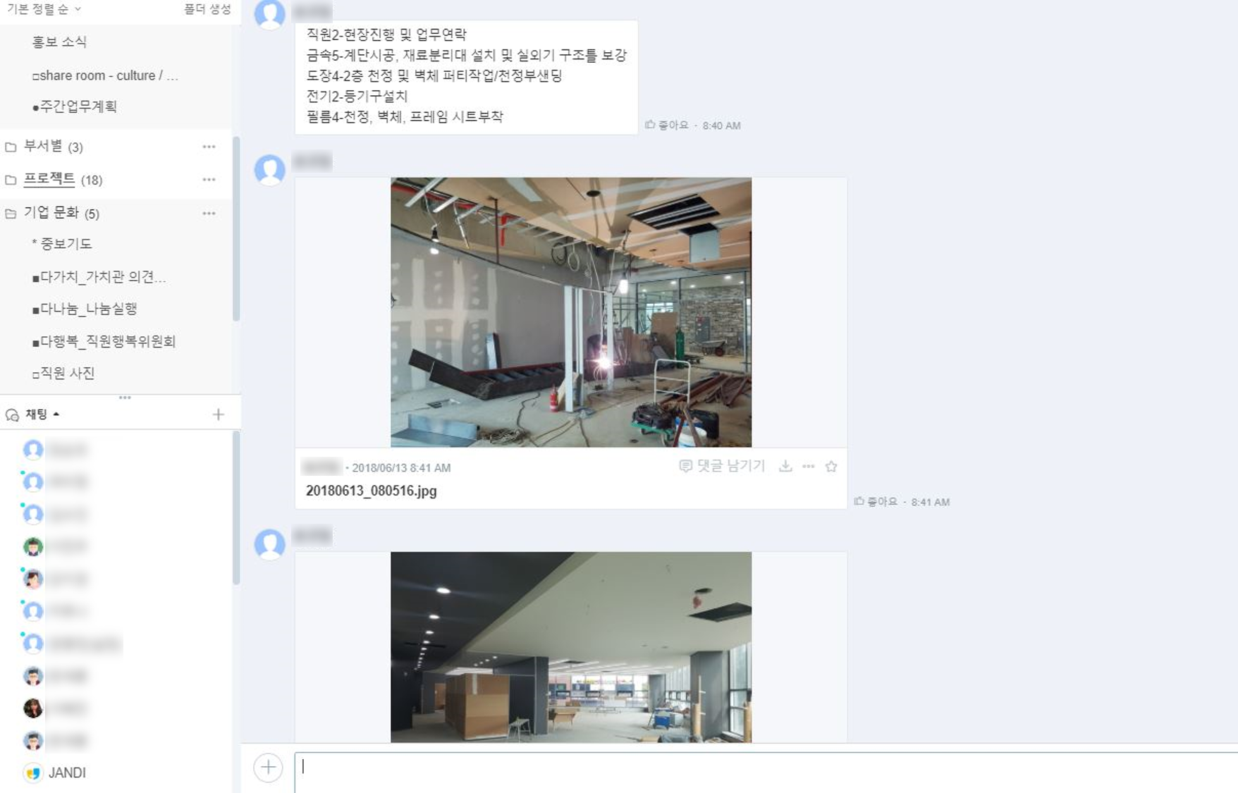 <잔디에 현장 사진을 전송하여 실시간으로 업무 논의를 하는 디자인다나함>