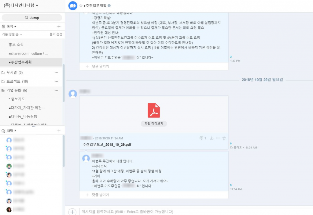 2. 팀 별/주제 별 토픽: 채용 토픽, 경영 토픽과 같은 일부 직원에게만 공유 가능한 토픽을 나눌 수 있어 보안 이슈가 해결되었습니다.