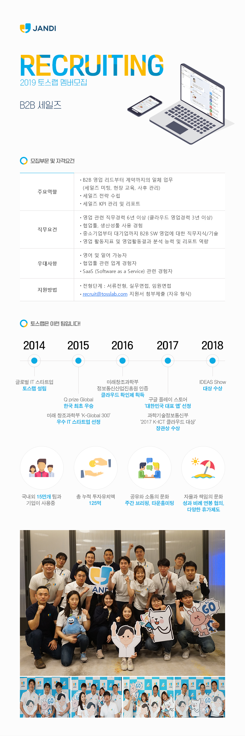 [멤버모집] 잔디 세일즈 매니저 게시일: 2019. 02. 25 Share 🕑 리딩타임: < 1 분<잔디, 함께 가꾸실래요?!> 더 많은 유저들이 협업과 스마트워크의 신세계를 만날 수 있도록 잔디의 세일즈를 책임질 멤버를 찾습니다. 아래 모집공고 내용을 확인하시고, 잔디, 함께 가꾸고 싶다면! recruit@tosslab.com 으로 자유형식의 지원서를 보내주세요~! 포스트 뷰: 1,533 B2BB2B 영업경력구인경력구직경력자채용 Share