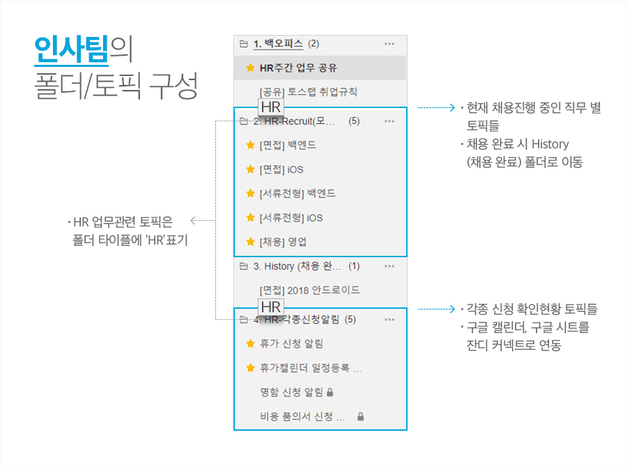 - HR 업무 관련 토픽은 분류가 쉽게 폴더 타이틀에 HR 표기