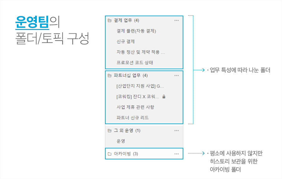 운영팀에서 실제로 사용하는 토픽 리스트와 폴더 예시입니다.