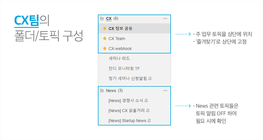 - CX 관련된 토픽들만 모아둔 CX폴더 그리고 News 채널만 모아둔 News 폴더