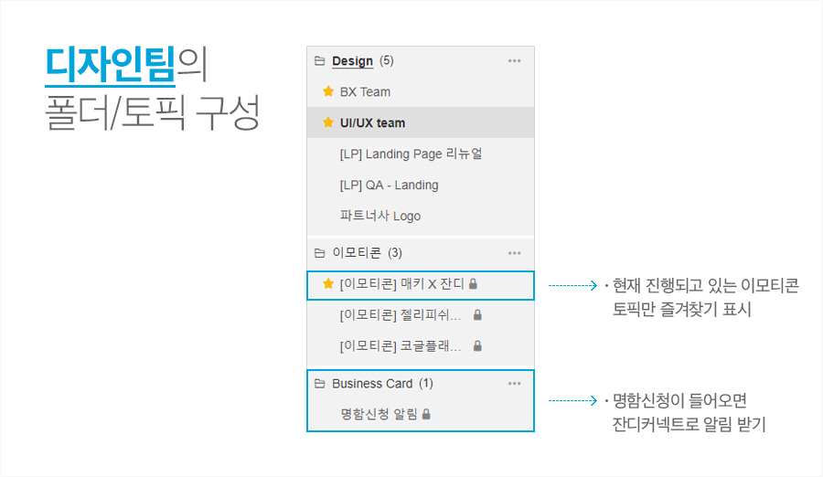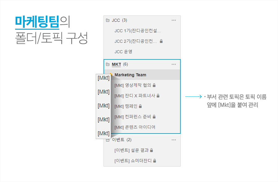 - 이벤트 폴더 : 새로운 이벤트나 행사가 진행될 때 이벤트 TF 토픽을 생성하여 관련 담당자를 초대해서 이용