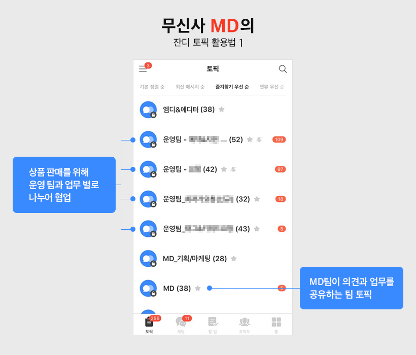 - 팀/주제별 소통: MD팀 전원이 의사를 결정하기위해 한 자리에 모이는 것이 굉장히 어려운 편입니다. MD팀 전용 토픽방이 있기 때문에 일일 업무와 마감일에 맞추어 업무가 진행되고 있는 지를 확인할 수 있어서 불필요한 미팅이 크게 줄어들었습니다. 기존에는 네이트온 단체방에서 업무와 크게 관련 없는 내용도 공유가 되어 굉장히 피로했습니다. 하지만 잔디에서는 주제별 또는 팀별로 업무를 구분하고 단체 대화방(토픽)을 만들어 공유하기 때문에 업무 파악이 빠르고 쉬워졌습니다.