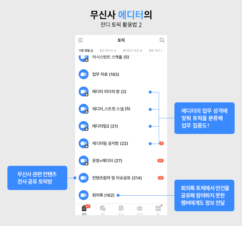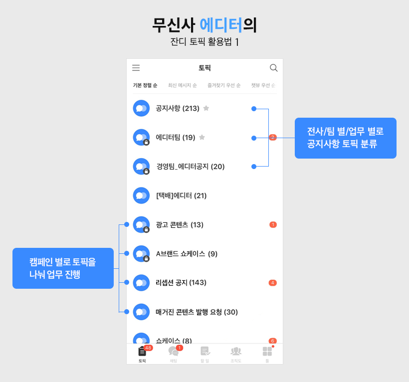 - 캠페인 운영: 여러 캠페인들이 동시에 진행되는데 각 캠페인 별로 프로젝트 대화방(토픽)을 생성하여 진행하기 때문에 업무 집중도가 높습니다.