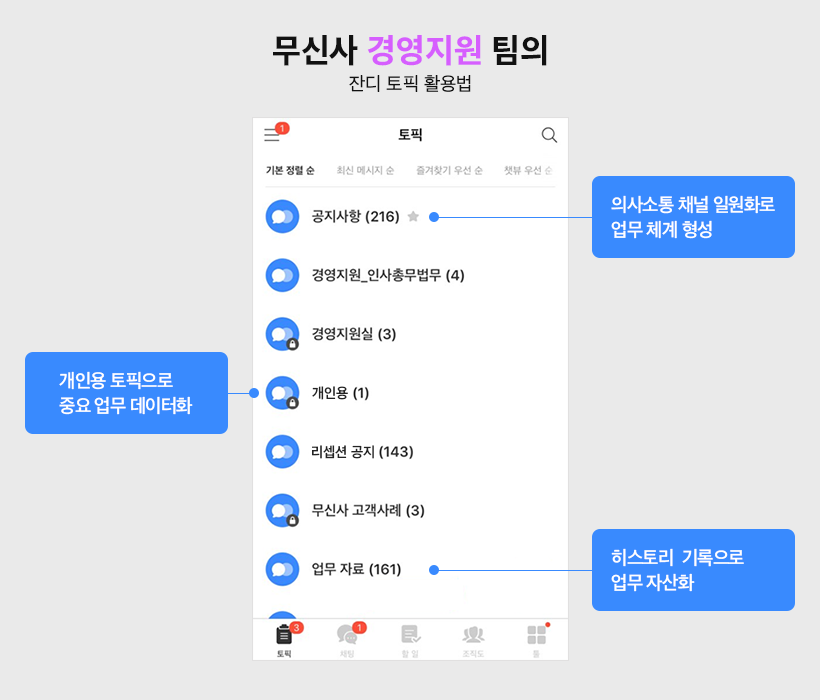 - 주제별 대화방: 건강검진이나 연말정산의 경우도 이벤트 별로 토픽을 생성하여 해당되는 직원만 초대하고 공유하기 때문에 효율적이고 빠른 업무 처리가 가능해졌습니다.