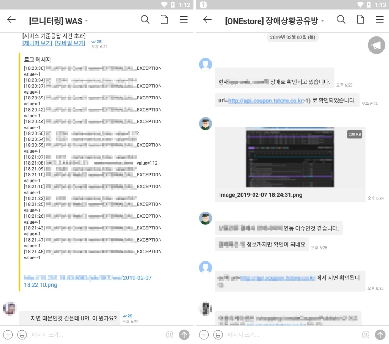 어플리케이션 성능 모니터링 서비스(APM, Application Performance Monitoring)인 Jennifer를 인커밍 웹훅(Incoming Webhook)으로 연동하여 서비스 상태를 실시간 자동으로 감지합니다. 이슈가 발생하는 값을 설정해 놓고 서비스 장애 발생 알람 시, ‘[ONEstore] 장애상황공유방’ 토픽에 공유해 신속히 장애를 해결할 수 있게 되었습니다.